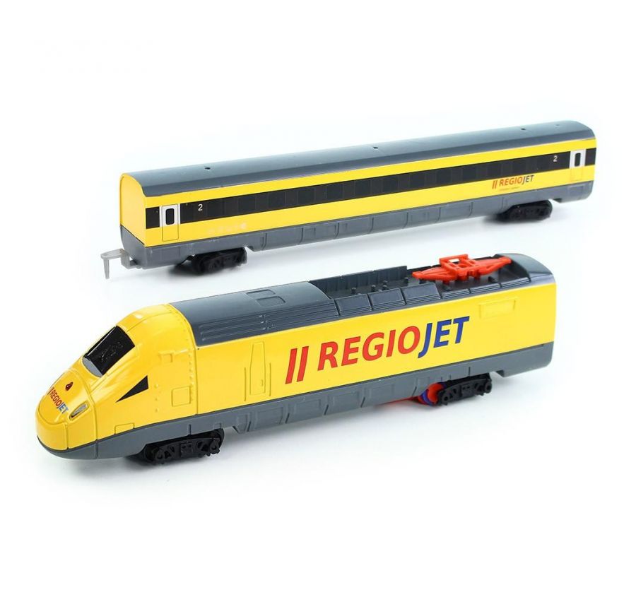 Originální žlutý vlak RegioJet od Student Agency. Sada obsahuje žlutou lokomotivu a žlutý vagón, 12 zahnutých a 6 rovných kolejí. Lze vytvořit kolejiště až do velikosti 147 x 121 cm (cca 4,5 m). Vlak vydává zvuk a svítí. Lokomotiva měří na délku 23,5 cm a vagón 30 cm. Lokomotiva jezdí na 2 ks AA baterií (nejsou součástí), na boční straně lokomotivy vypínačem ON/OFF (zapnuto/vypnuto) uvedete vlak do chodu. NOVĚ lze vlak RegioJet kombinovat s vlakem České dráhy.