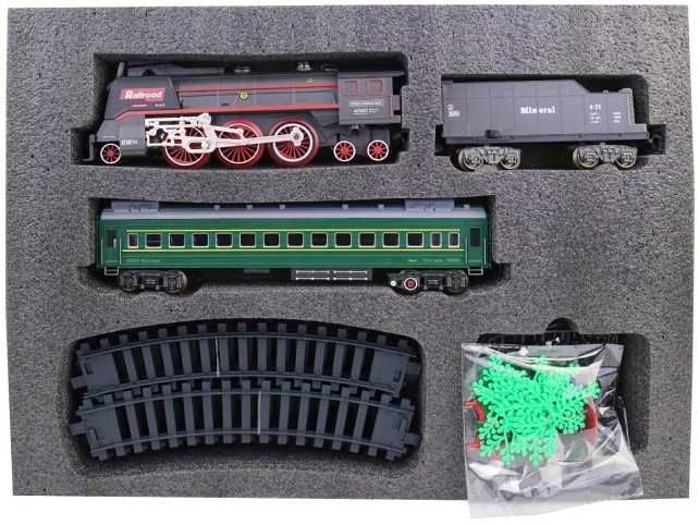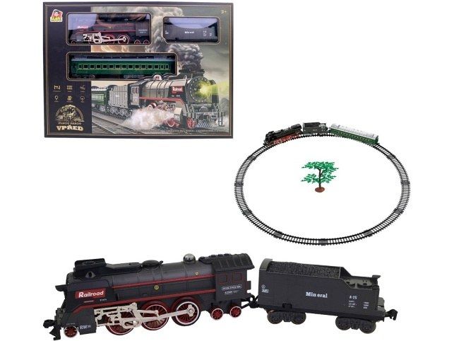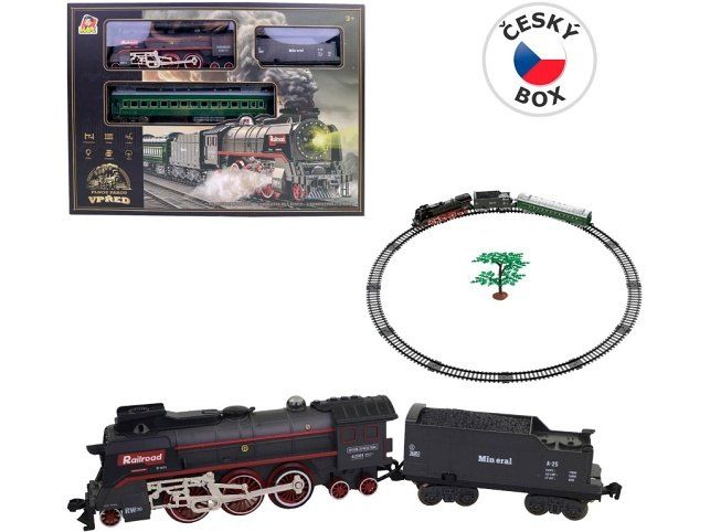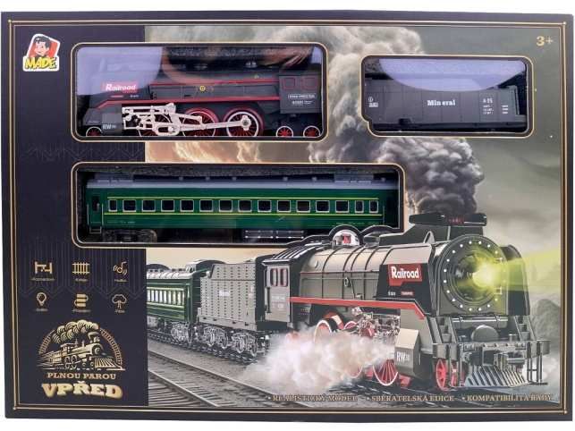 Vlaková souprava, parní lokomotiva, na baterie, světlo a zvuk, 92 x 92 cm. Velkou zajímavostí této sady je efekt páry, která vychází z komína lokomotivy. Dopřejte svému dítěti stát se strojvedoucím realisticky vyhlížejícího vlaku se skutečnými efekty. Pro zpestření celé hry má vlak zvukové a světelné efekty. Montáž kolejnic je velmi jednoduchá. Napájení: baterie (není součástí balení). Materiál hračky je plast. Určeno pro děti 3+.