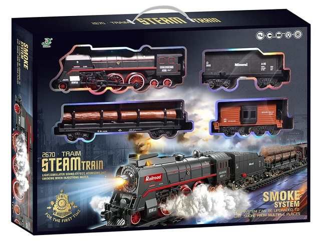 Vlaková souprava, parní, na baterie, světlo, zvuk, 48 kusů, 92,5 x 92 cm. Velkou zajímavostí této sady je efekt páry, která vychází nejen z komína, ale i z podvozku lokomotivy. Dopřejte svému dítěti stát se strojvedoucím vlastního neobvyklého vlaku. Pro zpestření celé hry má vlak zvukové a světelné efekty. Montáž kolejnic je velmi jednoduchá. Napájení: baterie 3 x 1,5V AA (není součástí balení). Materiál hračky je plast. Určeno pro děti 3+.