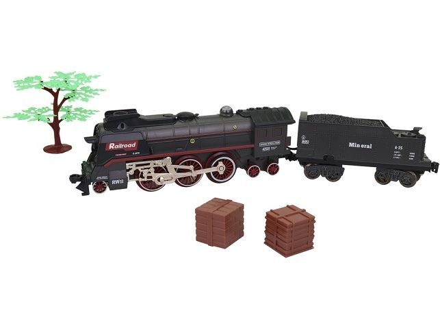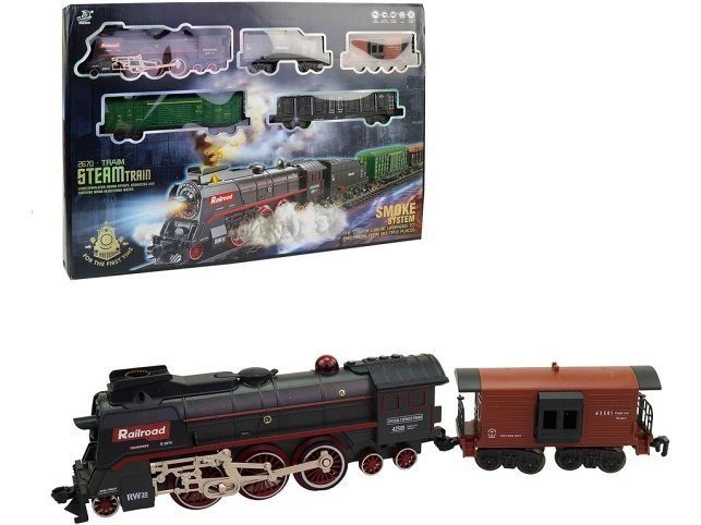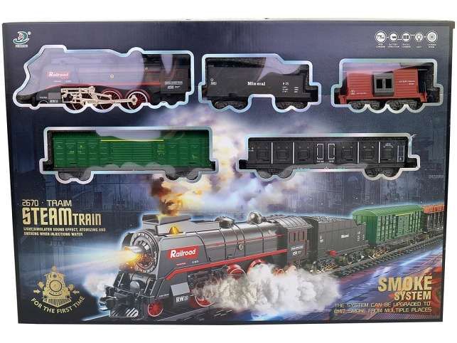 Vlaková souprava, parní, na baterie, světlo, zvuk, 68 kusů, 151 x 92,5 cm. Velkou zajímavostí této sady je efekt páry, která vychází nejen z komína, ale i z podvozku lokomotivy. Dopřejte svému dítěti stát se strojvedoucím vlastního neobvyklého vlaku. Pro zpestření celé hry má vlak zvukové a světelné efekty. Montáž kolejnic je velmi jednoduchá. Napájení: baterie 3 x 1,5V AA (není součástí balení). Rozměr balení: 60 x 6 x 42 cm. Materiál hračky je plast. Určeno pro děti 3+.