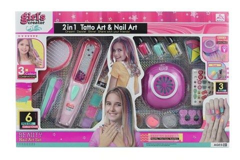 Velká sada pro malé parádnice. Balení obsahuje vlasové a nehtové doplňky-kartáč na vlasy, tetovačku třpytek do vlasů, křídy na vlasy, sponky, nehtovou troubičku na baterie (2xAA, nejsou součástí balení), 3 laky, pilníček, samolepky, třpytky a rozdělovník. Baleno v krabici. Rozměry balení cca 46x29,5x7 cm. Věk 6+