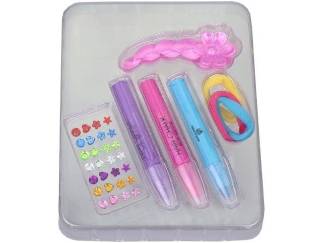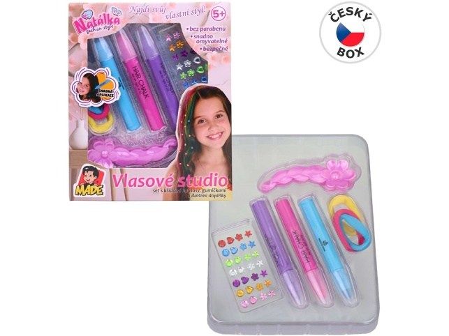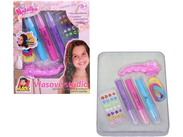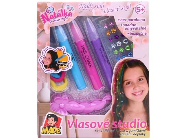 Vlasové studio, barvení vlasů, doplňky, 17,5 x 3,2 x 21,5 cm. Vytvoř si vlastní originální účes a budeš hvězdou. Culík nebo cop, barvy a polepuj. Skvělá zábava nejen pro tebe ale i pro tvé kamarádky. Hračka je určena pro děti 5+. Rozměr hračky je 17,5 x 3,2 x 21,5 cm. Materiál hračky je plast. Balení hračky je window box. Produkt je určený pro holky. Baterie nejsou součástí balení.