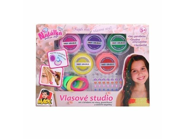 Vlasové studio, set s barvami na vlasy, gumičkami a doplňky, 26,5 x 3 x 20 cm. Vytvoř si vlastní barevné kombinace. Barvení je velice snadné stačí vložit zvolený pramínek na barvu zavřít barvu a stáhnout barvu po pramínku směrem dolů. A je hotovo! Teď si můžeš vlasy dozdobit gumičkou nebo ozdobné kamínky. Balení obsahuje 5 barev. Hračka je určena pro děti . Rozměr hračky je 26,5 x 3 x 20 cm. Materiál hračky je plast. Balení hračky je window box. Produkt je určený pro holky. Baterie nejsou součástí balení.