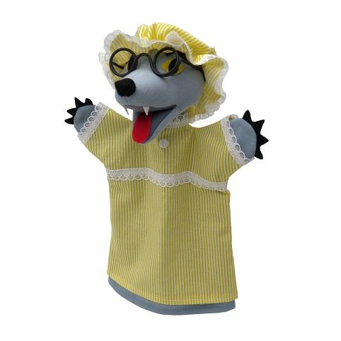 Textilní maňásek vlka z pohádky o Červené karkulce. Je oblečený do noční košile, kterou lze i s čepečkem sundat a z hodné babičky je rázem zlý vlk.