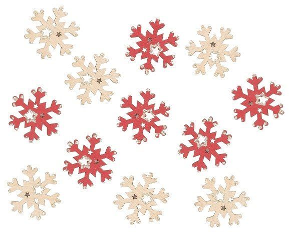 Vločka dřevěná s lepíkem 4 cm červená a přírodní, 12 ks