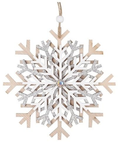 Vločka dřevěná se stříbrným glitrem a kamínkem na zavěšení 15 cm