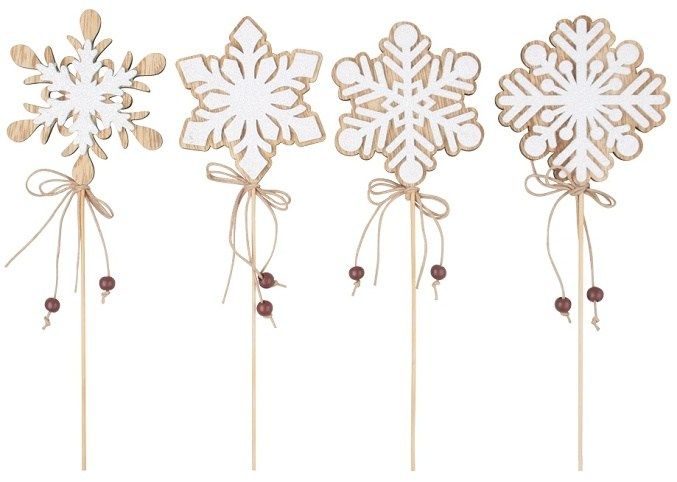 Vločka s bílým glitrem dřevěná 7,5 cm + špejle