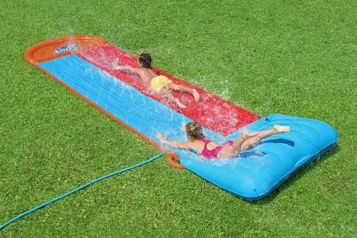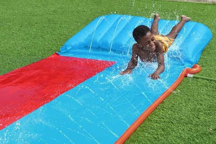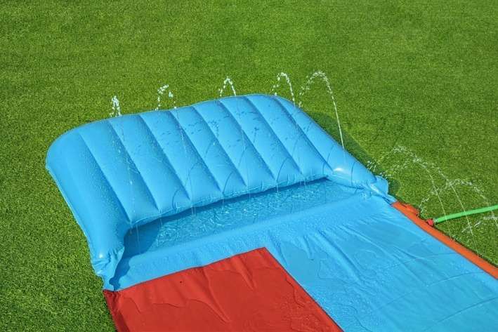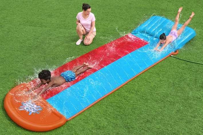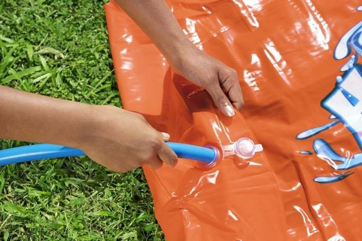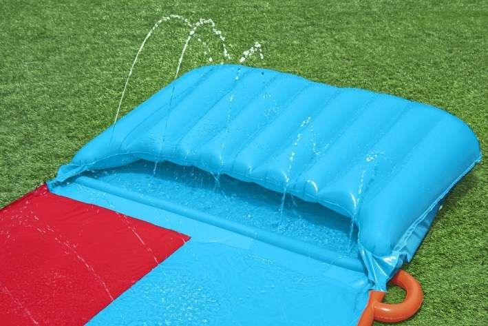 Délka 4,88 m, oranžovo-červeno – modrá vodní skluzavka, 2 dráhy. Opravná záplata součástí balení. Užijte si skvělou letní zábavu na vaší zahradě s vodní skluzavkou. Sestavení je velmi snadné – stačí připojit zahradní hadicí a začít se klouzat