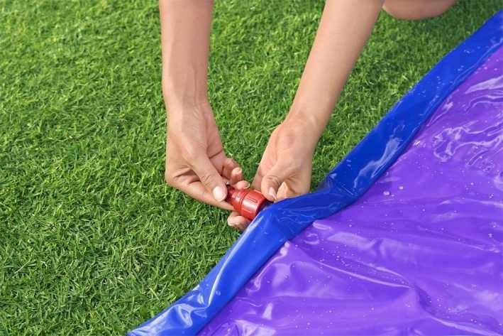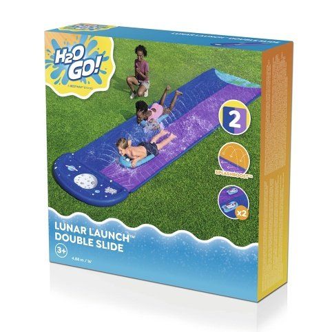 Délka 4,88 m, modro -fialová vodní skluzavka, 2 dráhy. Opravná záplata součástí balení. Užijte si skvělou letní zábavu na vaší zahradě s vodní skluzavkou. Sestavení je velmi snadné – stačí připojit zahradní hadicí a začít se klouzat!