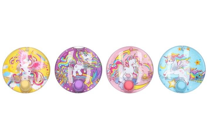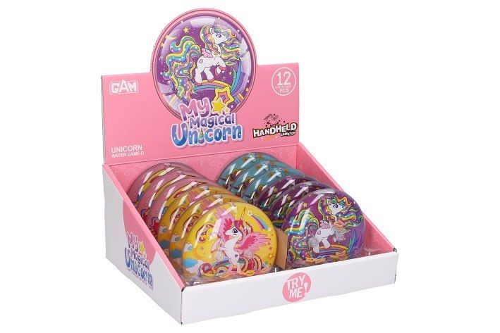 Vodní hra jednorožec. Rozměry 10x10x3 cm. 12 ks display box. 4 varianty pozadí - modré, růžové, fialové, žluté.