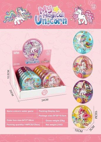 Vodní hra jednorožec. Rozměry 10x10x3 cm. 12 ks display box. 4 varianty pozadí - modré, růžové, fialové, žluté.
