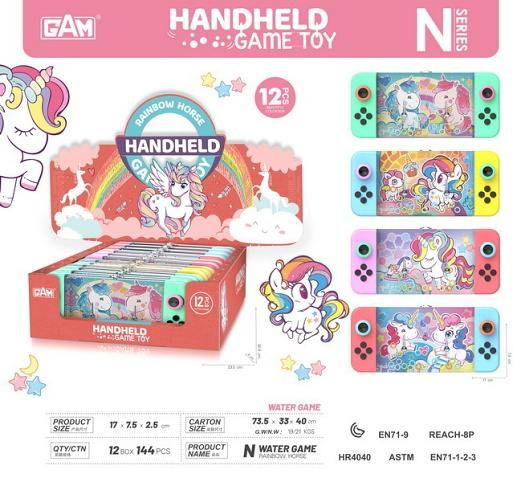 Vodní hra jednorožec. Rozměry 17x7,5x3 cm. 12 ks display box. 4 varianty.