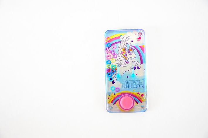 Vodní hra s obrázky jednorožce. Snaž se pomocí tlačítka dostat všechny kroužky na tyčku.