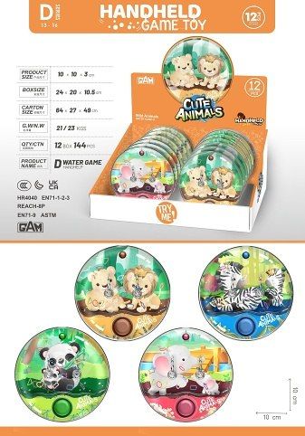 Vodní hra zvířátka. Rozměry 10x10x3 cm. 12 ks display box. 4 varianty - lev, žirafa, panda, slon.