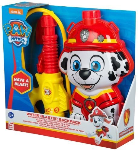 Vodní pistole se zásobníkem Tlapková patrola Chase – obsahuje zásobník na vodu s nastavitelnými popruhy, kterou dítě může nosit jako batoh, a k ní připojená gumová hadička, která je spojena přímo s vodní pistolí. Zásobník lze plnit ze shora a je uzavřen víčkem Funguje jako ruční čerpadlo.