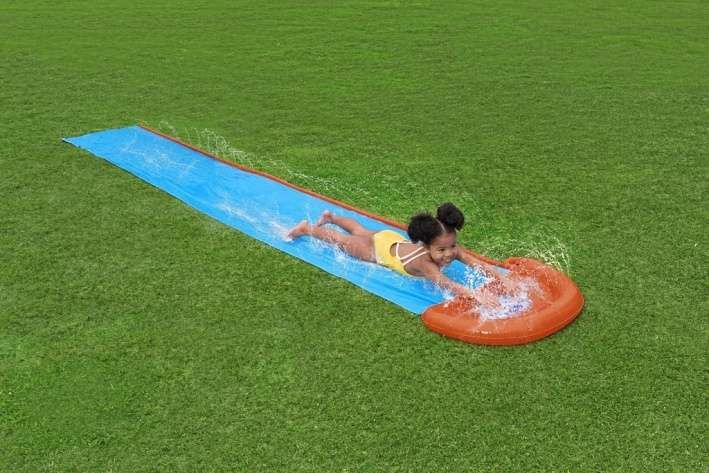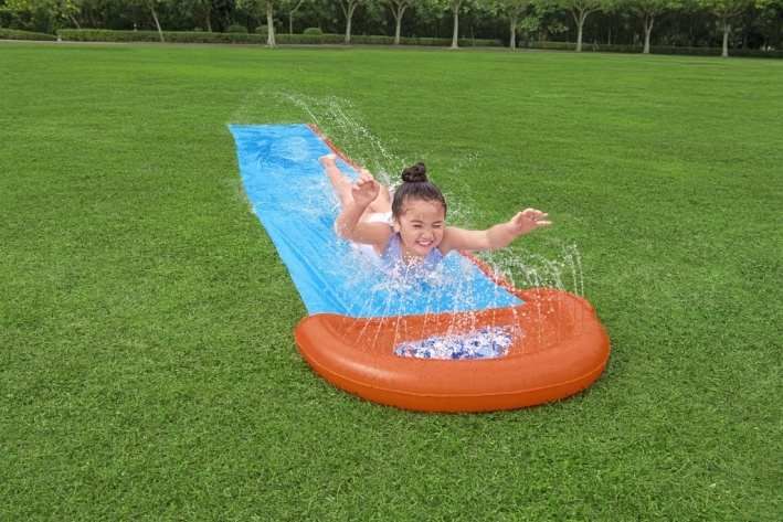 S touto parádní skluzavkou zažiješ tu pravou letní zábavu. Vyrobeno z testovaného masivního vinylu. Přibližná velikost je 488 cm. Skluzavku zapoj do zahradní hadice a užij si spoustu zábavy. Zabudovaná sprška v přední části skluzavky. Opravná záplata součástí balení.