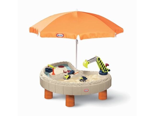 Stolek má 2 části pro odlišné aktivity – písek a voda, slunečník,