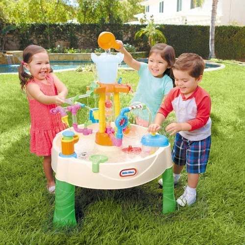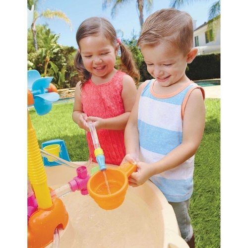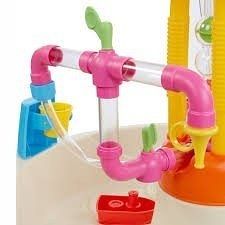 Velikost 95,3x75x75 cm, výška desky cca 44 cm, obsahuje potrubí pro stavbu kanalizace s vodními tryskami a mlýny a 3 další příslušenství: člun, lopatka - pohár na vodu, trychtýř, věž s fontánou