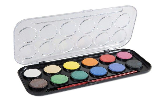 Školní vodové barvy ve 12ti barvách o průměru koláče 30mm v obdelníkovém, plastovém pouzdře s transparentním víčkem. Součástí balení 1 štětec. Dodávané v závěsu.