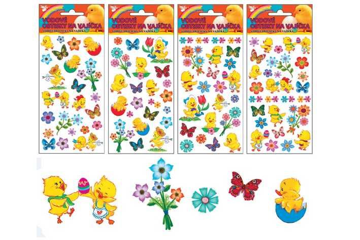 Vodové obtisky na vajíčka 18,5 x 8,5cm Návod: -vystřihněte zvolený motiv -odstraňte krycí fólii -celý obrázek ponořte do misky s vodou -přiložte na vařené vajíčko obrázkem na skořápku a jemně přitiskněte -počkejte 20-30 sekund a opatrně odstraňte podkladový papír -nechte zaschnout Cena za 1 platíčko, dodáváme v mixu motivů.