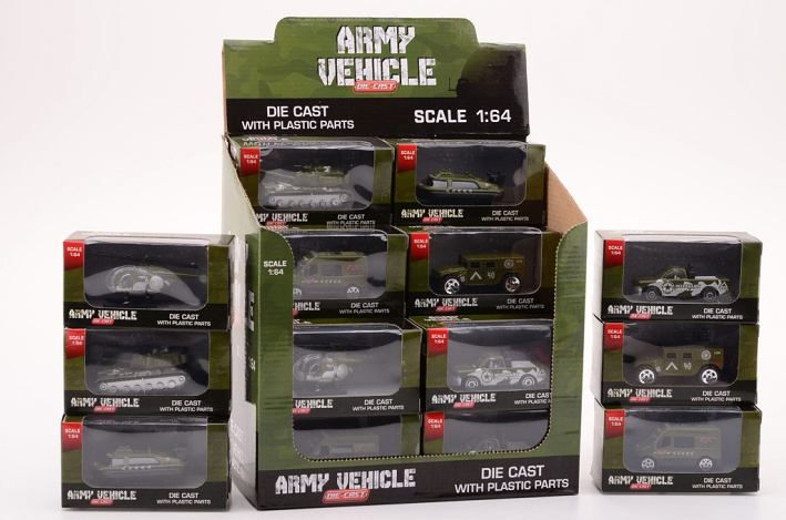 Kovový model vojenského autíčka 1:64 s plastovými částmi.8 různých druhů.
