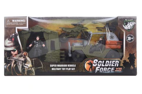 Plastová vojenská sada obsahující stan, džíp, motorku a vojáčky. Rozměry balení cca 46 x 12 x 20 cm. Věk 3+