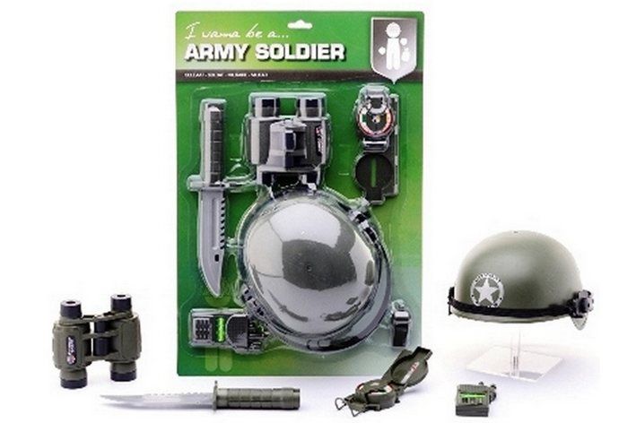 Vojenská sada obsahuje přilbu, kompas, dalekohled, nůž a další vybavení pro vojáky.