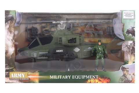 Vojenská sada obsahuje helikoptéru o velikosti 35 x 15 cm, figurku vojáka a další doplňky v podobě zbraní a výstroje. Rozměr balení cca 38,5 x 21,5 x 13,5 cm. Věk 3+