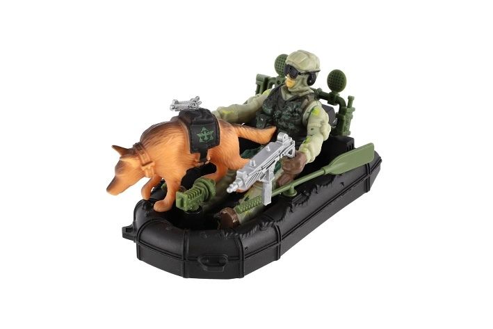 Vojenská sada plast člun, voják, pes s doplňky v krabici 23x14x4cm
