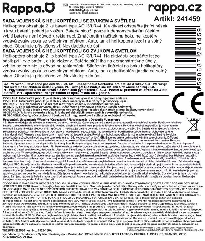 Vydej se na vojenskou misi s tímto parádním vybavením! Sada pro malé vojáky obsahuje helikoptéru 42 cm, vojenský jeep 20 cm, tank 12 cm, 3 vojáky a drobné příslušenství. Helikoptéra po aktivování tlačítek vydává reálné zvuky spolu se světelným efektem. Tato funkce vyžaduje použití 2 ks baterií typu LR44, které jsou součástí výrobku. Auto jeep jezdí na volný chod. Tato sada nesmí chybět ve tvé armádní jednotce!