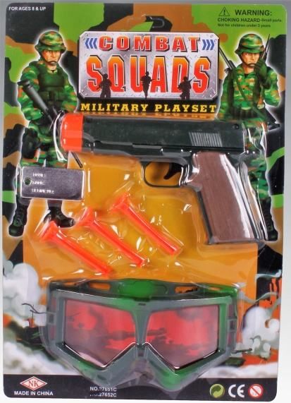 Vojenská sada s pistolí, šipkami a krytem na oči.
