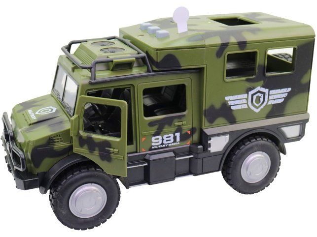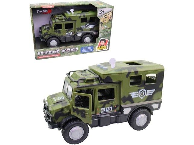 Vojenské auto, na baterie, světlo a zvuk, setrvačník, 25 cm. Hračka je určena pro děti 3+. Rozměr hračky je 25 x 10,5 x 13 cm. Materiál hračky je plast. Balení hračky je otevřený box. Produkt je určený pro kluky. Ke zprovoznění produktu jsou potřeba 3 AG13 baterie. Baterie jsou součástí balení.