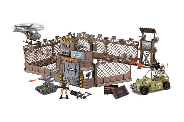 ojenské opevnění s vrtulníkem s efekty. Vozidla střílející náboje a síť. Obvod opevnění 177 cm. Velikost vrtulníku 25 cm, vojáků 10 cm. Světelné a zvukové efekty tlačítky na levé straně vrtulníku. 3xAG10 baterie do vrtulníku součástí. Obsah - vrtulník, 2 střílející vozidla, opevnění, bedna s náboji, síť, zbraně, 3 figurky vojáků.
