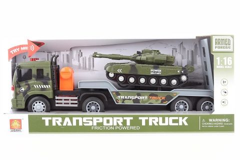 Vojenský kamion s tankem na baterie. Kamion svítí a vydává zvuky. Napájení na 3 AG13 baterie (jsou součástí). Rozměry balení cca 42 x 18,5 x 12 cm. Věk 3+