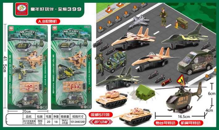 Vojenský set. Na zpětné natažení. Velikost vrtulníku 16,5 cm. Součástí vrtulník, 2 stíhačky, tank, auto.