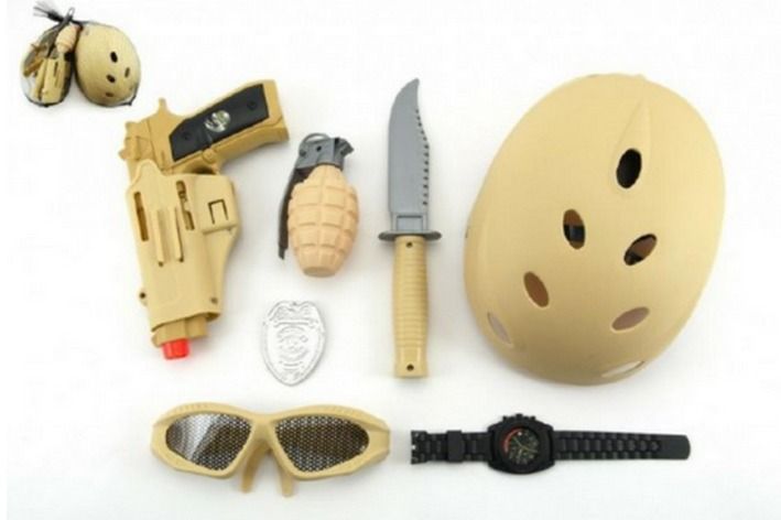 Balení obsahuje: helmu, brýle, policejní odznak, granát, nůž a hodinky.