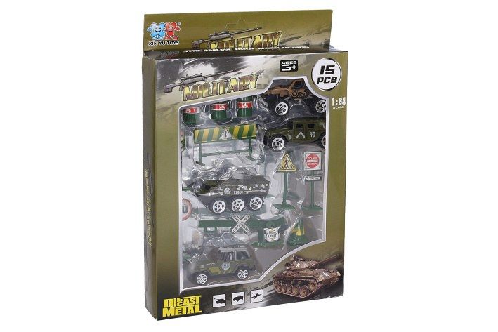 Vojenský set. Velikost dopravních prostředků 7 cm. Volná kola. 4 kovové dopravní prostředky, značky, zábrany, kužely, barely a další. 2 varianty - tank, bugina.