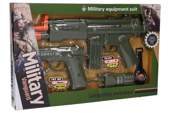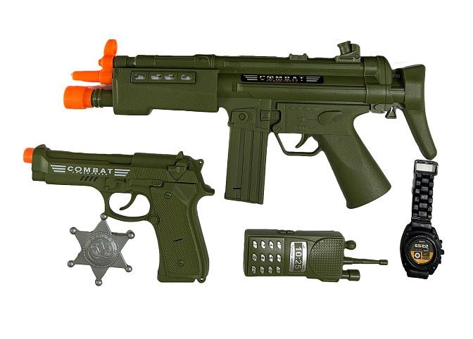 Vojenský set se samopalem. Obsah balení - samopal 39x17 cm, pistole 20x13 cm, odznak, vysílačka, hodinky. Vydává světelné a zvukové efekty. Samopal - 2xAA baterie, součástí balení.