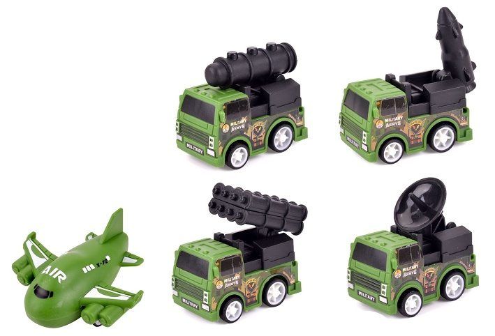 Vojenský technika 5 ks. Velikost dopravních prostředků 5,5 cm. Na zpětné natažení.