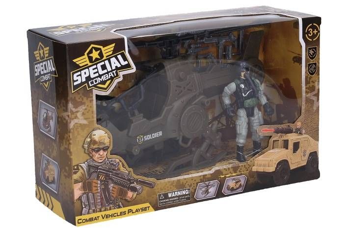Vojenský vrtulník s pilotem. Velikost vrtulníku 23 cm, figurka pilota 9,5 cm.