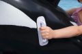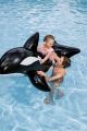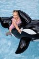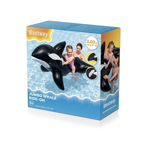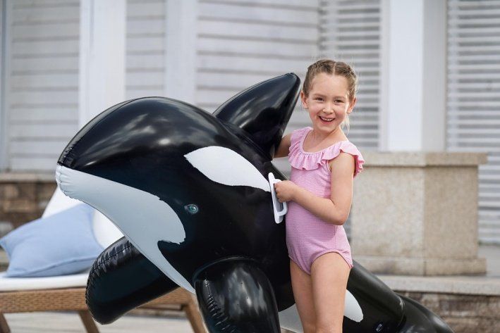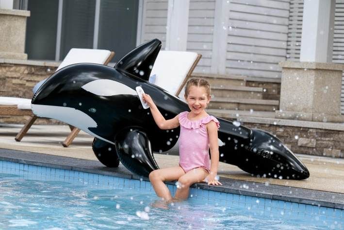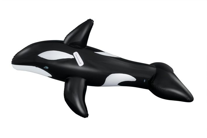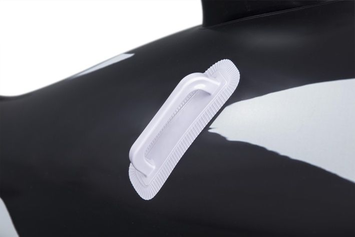 Nafukovací hračka ve tvaru kosatky je určena především pro děti od tří let, které rády tráví čas ve vodě. Tento model má rozměry 203 × 102 cm a je vyroben z pevného a odolného vinylu, což zajišťuje dlouhou životnost i při častém používání v bazénu nebo na jiných vodních plochách. Povrch hračky je hladký a barevně věrně zpracovaný – černá barva s bílými detaily na bocích a břiše věrně napodobuje skutečnou kosatku. Kosatka je navržena tak, aby byla stabilní a bezpečná pro děti. Disponuje dvěma vzduchovými komorami, což zvyšuje její bezpečnost a umožňuje lepší udržení vzduchu uvnitř. Maximální nosnost nafukovací hračky je 45 kilogramů, což umožňuje pohodlnou jízdu dítěti i s doprovodem dospělé osoby. Pro snadné uchopení a lepší rovnováhu jsou na bocích umístěny dvě bílé plastové rukojeti, které dobře padnou do dětské ruky a umožňují pevný úchop během jízdy na vodě. Ventily na nafukování jsou vybaveny zámky, které zabraňují úniku vzduchu a zajišťují pevné a bezpečné uzavření. Tvar kosatky je velmi detailní – kromě klasických ploutví má také výrazný hřbetní ploutev a robustní ocas, které přispívají k věrnosti vzhledu i stabilitě hračky. Celkově je nafukovací kosatka vhodná jako zábavná a praktická vodní hračka, která podpoří aktivní pohyb a zábavu dětí během letních dní u vody.