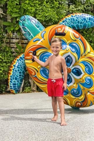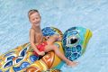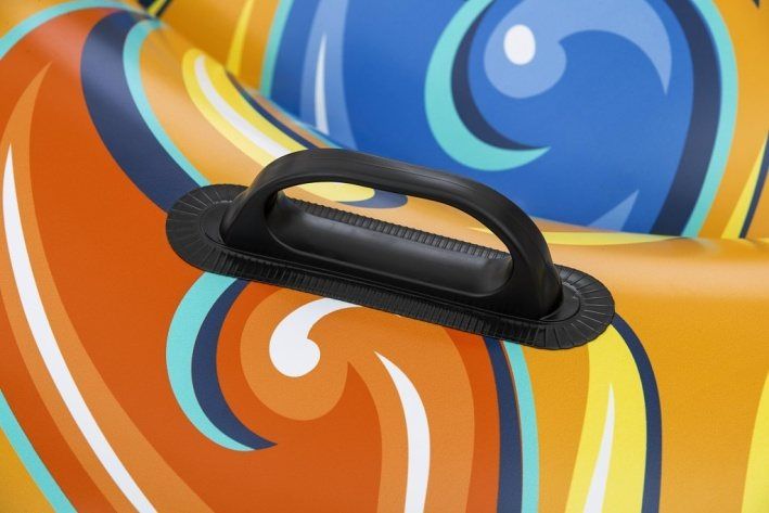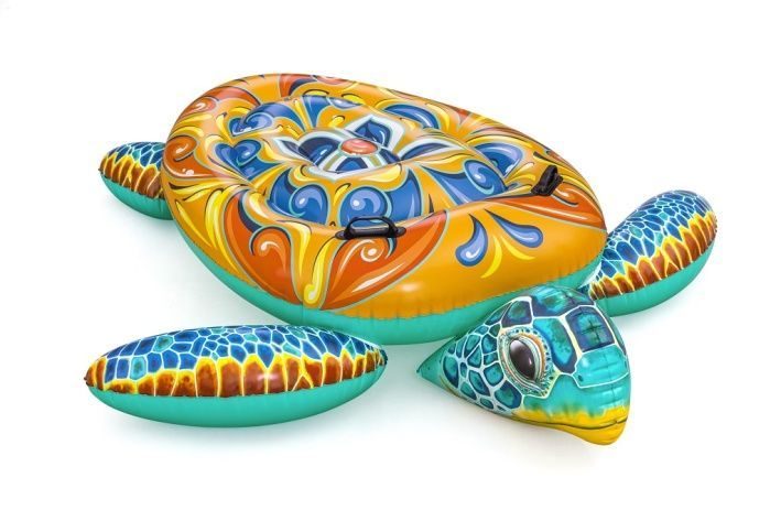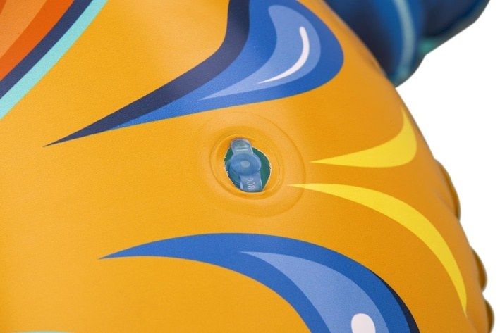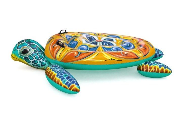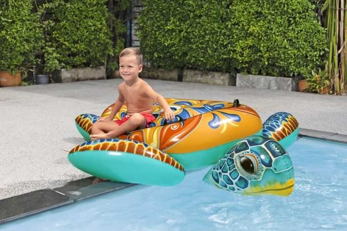 Nafukovací želva je vodní hračka určená pro děti od 3 let, která zaujme svým atraktivním a barevným designem připomínajícím mořskou želvu. Její rozměry jsou 183×173 cm, což poskytuje dostatek prostoru pro pohodlné sezení či ležení dítěte při hře na vodě. Hlavní část nafukovací želvy je zdobena výraznými vzory v odstínech oranžové, modré, žluté a bílé, zatímco hlava a ploutve jsou zpracovány v realistických modro-zelených tónech s jemnými detaily připomínajícími želví kůži. Hračka je vyrobena z odolného vinylu, který je pevný a vhodný do vody, což zaručuje dlouhou životnost i při častém používání. Nafukovací želva má dvě vzduchové komory, což zvyšuje bezpečnost a stabilitu na vodní hladině. Součástí konstrukce jsou také dva pevné plastové úchyty umístěné po stranách na vrchní části těla želvy, které usnadňují držení a udržení rovnováhy při jízdě. Maximální nosnost této vodní hračky je 85 kg, což ji činí vhodnou pro většinu dětí. Ventil pro nafouknutí je dobře přístupný a zajišťuje rychlé a bezpečné uzavření vzduchové komory. Želva je navržena tak, aby se snadno nafukovala a vyfukovala, což usnadňuje manipulaci a skladování. Celkově tato nafukovací hračka nabízí zábavu a bezpečnost pro děti při pobytu ve vodě, a to jak v bazénech, tak na klidných vodních plochách. Je to vhodný doplněk ke sportovním a venkovním hrám během letních dnů.