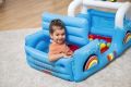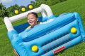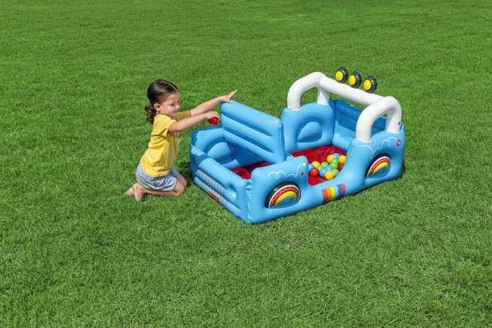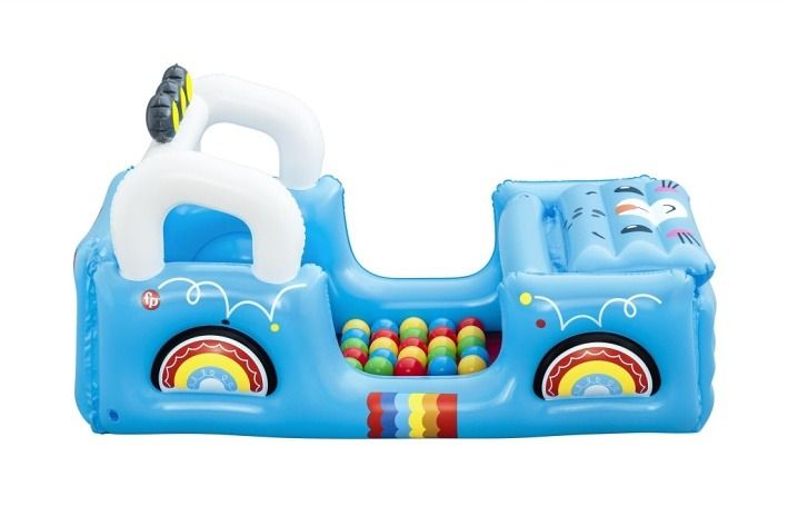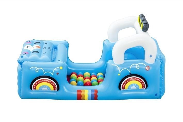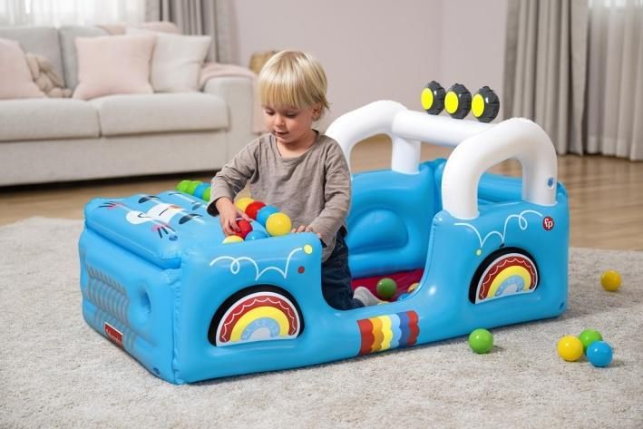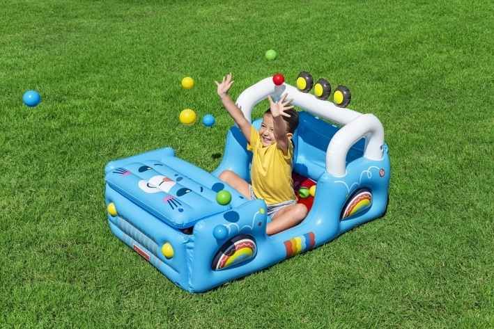 Vozidlo Safari nafukovací od značky Fisher Price je navrženo jako hrací bazének ve tvaru terénního auta s motivy džungle a zvířátek. Nafukovací konstrukce má výraznou modrou barvu s barevnými detaily, které připomínají kola a karoserii vozidla. Přední část bazénku tvoří otvírací kapota s obrázkem roztomilého zvířete, která umožňuje snadný přístup do prostoru uvnitř. Vozidlo je opatřeno bílými oblouky připomínajícími rám auta, s třemi černými světly s žlutými středovými prvky na střeše. Celý bazének má rozměry 117 × 76 × 61 cm, což poskytuje dostatek prostoru pro hru i pohyb dítěte. Uvnitř vozidla se nachází měkká červená podlaha a prostor naplněný 25 barevnými hracími míčky v odstínech žluté, modré, červené a zelené. Tento bazének s míčky je určen pro děti od 2 let a podporuje rozvoj jemné motoriky, koordinace rukou a očí, stejně jako představivosti a sociálních dovedností při interaktivní hře. Nafukovací bazének je vhodný pro použití jak ve vnitřních prostorách, tak na zahradě nebo jiných venkovních plochách. Materiál bazénku je pevný a odolný, s bezpečnými ventily pro snadné nafouknutí i vyfouknutí. Součástí balení je i záplata pro případné opravy, která prodlužuje životnost produktu. Design je doplněn veselými obrázky zvířat na zadní stěně vozidla, které přispívají ke hravému a přívětivému vzhledu. Celkově jde o multifunkční hračku, která dětem nabízí zábavu, pohyb a rozvoj důležitých dovedností v bezpečném prostředí.