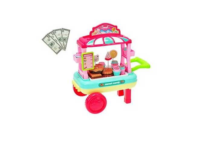 Pojízdný vozík pro všechny malé prodavače. Sada obsahuje vozík, příslušentsví, peníze.
