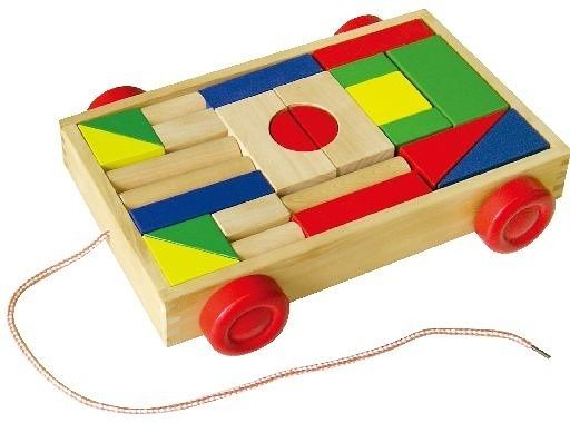 Dřevěný vozík plný barevných kostiček. Díky pevné šňůrce ho za
