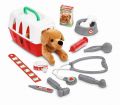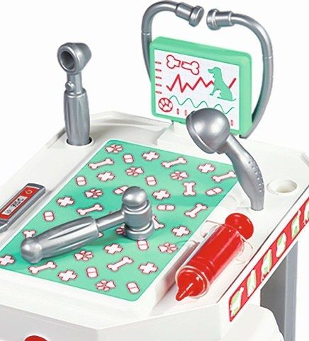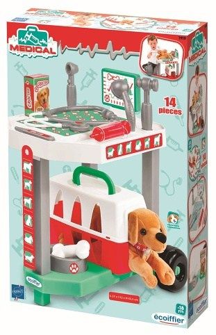 Veterinární set se skládá z vyšetřovacího vozíku, přepravky, misky na krmení a různých lékařských pomůcek jako je injekční stříkačka, palička, stetoskop, sprchová hlavice a teploměr. Součástí je roztomilý plyšový pejsek. Díky praktickým kolečkům lze snadno ovladatelný veterinární vozík posouvat tam a zpět. Jednotlivé doplňky se obzvlášť snadno uchopují a nemají ostré hrany, takže jsou zvláště bezpečné pro malé děti. Vyrobeno ve Francii. Rozměry (DxŠxV): 36,5 x 32 x 51 cm.