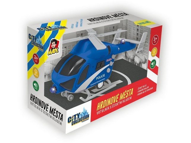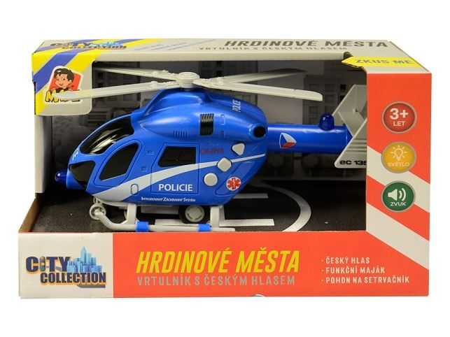 Policejní vrtulník v českém designu s českým hlasem. Simuluje rozhovor dispečinku a pilota:Dispečink: Hromadná nehoda na čtyřicátém kilometru dálnice. Na místě jsou ranění. Ihned se připravte k odletu. Pilot: Cíl na dohled. Zahajuji sestup. Připravte se k zásahu. Vrtulník je na setrvačník a obsahuje světelné a zvukové doplňky. Funkční maják. Rozměry boxu 23 x 13,5 x 10 cm. Český boxVrtulník je napájen bateriemi 3x AG13 (jsou součástí balení). Vhodné pro děti od 3 let