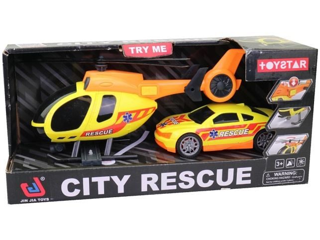 Vrtulník s autem ambulance, 20,8 x 7,5 x 12,5 cm s funkční vrtulí. Vytvořte si doma svůj vlastní heliport s vlastním vrtulníkem a užijte si všech jeho předností. Připravte se k zásahu. Vrtulník obsahuje funkční vrtuli a určitě se stane středem pozornosti při jakékoliv akci. Rozměry boxu 36,5 x 11 x 17,5 cm. Vrtulník je napájen bateriemi 3 x AG13 (jsou součástí balení). Materiál: plast. Vhodné pro děti od 3 let.