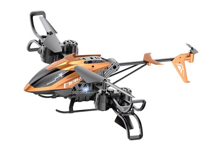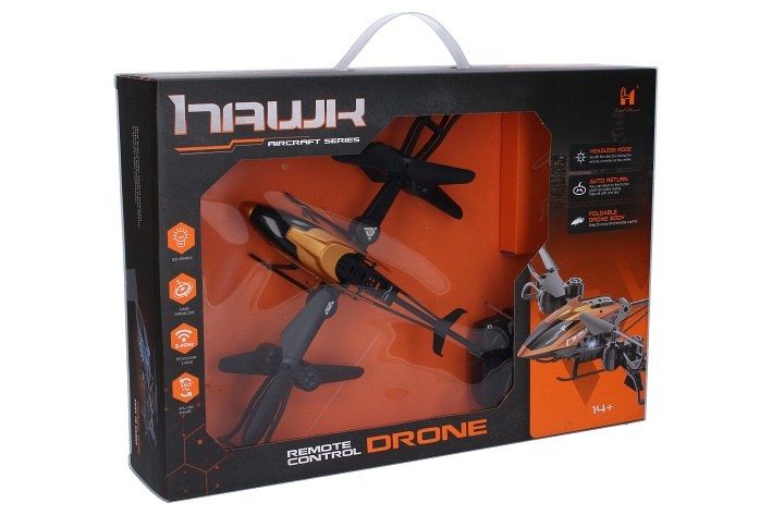 Vrtulník se sklopnými křídly RC na dálkové ovládání. Rozměry 26x32x7 cm. Délka 26 cm, rozpětí křídel 32 cm. Frekvence 2. 4 GHz. Sklopná křídla, přemet o 360 stupňů, nastavení rychlosti, vzlet a přistání tlačítkem, navrácení do výchozího bodu. Světelné efekty. Bateriový pack 3. 7V 580mAh do vrtulníku součástí, 3xAA do ovladače nejsou součástí. USB kabel a náhradní křídla součástí. Přepínač ON/OFF na boční straně vrtulníku a na ovladači. Nabíjení 80-100 min, dosah 50 m.