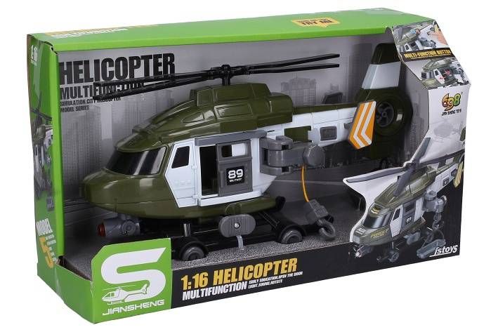 Vrtulník vojenský s efekty. Rozměry 29x9,5x14 cm. Světelné a zvukové efekty tlačítkem na křídle. 3xAG13 baterie součástí. Stlačením páčky pod dveřmi se otáčí hlavní vrtule. Kolečkem na konci křídla se otáčí vrtule v křídle. Manuální navíjecí hák.